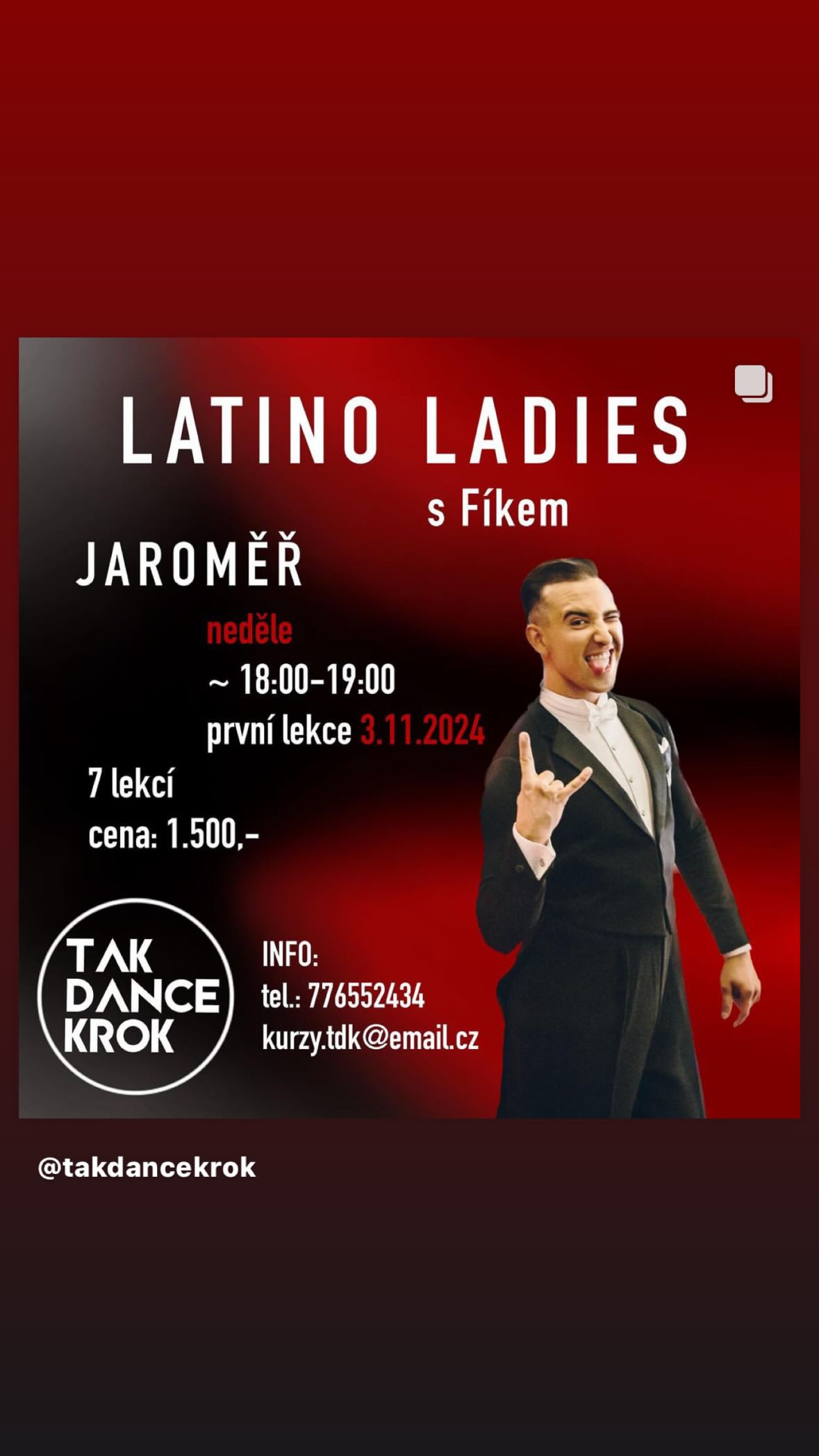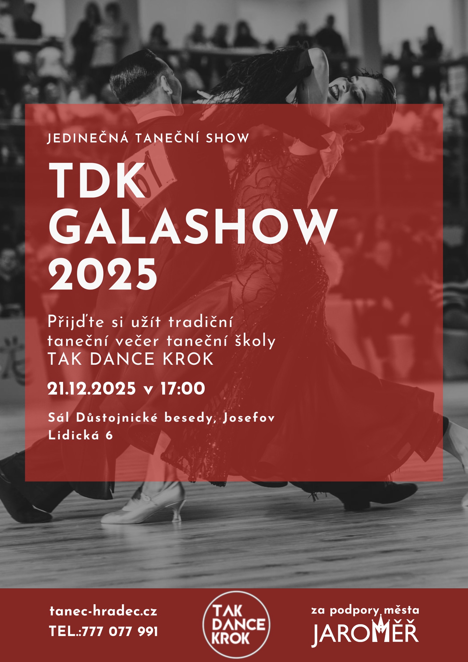 Srdečně Vás zveme na jedinečnou taneční událost roku! ✨ TDK GALASHOW 2025 ✨ Tradiční taneční večer taneční školy TAK DANCE KROK Přijďte si užít nezapomenutelnou atmosféru, krásné taneční choreografie a vystoupení plná energie i elegance. Čeká Vás pestrý program, ve kterém se představí